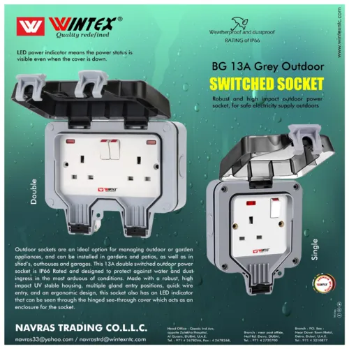 The WINTEX WATERPROOF SWITCH SOCKET is a reliable and durable solution for outdoor power supply, designed to provide safe electricity access in harsh environments. With an IP66 rating, it offers excellent protection against water and dust, making it ideal for outdoor installations. It features a robust, high-impact, UV-stable housing and includes an LED indicator that shows power status even when the cover is closed.