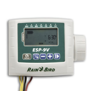 The Rain Bird ESP-9V is a rugged, battery-operated controller designed for sites without AC power. Featuring an IP68 waterproof case, dual-sealed battery chamber, and support for 1 to 6 zones with independent scheduling for professional irrigation management.