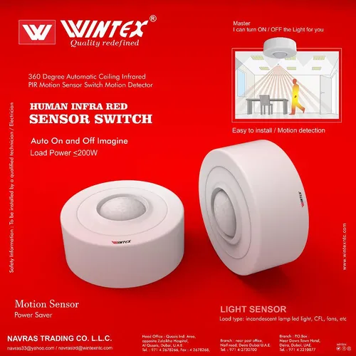The WINTEX SENSOR SWITCH is a smart and efficient solution for automatic lighting control. It uses PIR (infrared) technology to detect motion and automatically turn lights ON and OFF. With a 360-degree detection angle, it provides full area coverage, making it ideal for homes, offices, hallways, and storage areas. It also helps save energy by activating lighting only when needed.